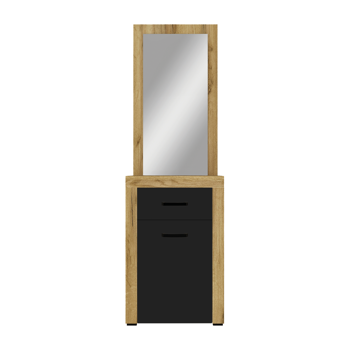 Чудова містка тумба з великим дзеркалом ідеально підійде до меблів у Вашому передпокої. Вона має одну шухляду, дві полички за дверима та багато місця біля дзеркала.Розміри: