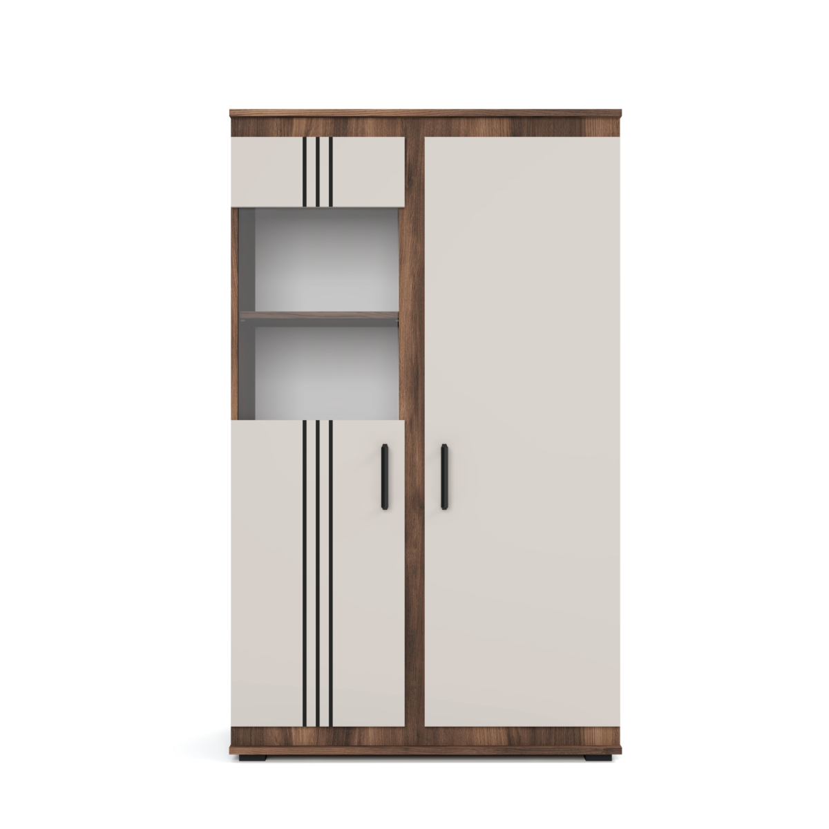 Пенал вітрина 2Д — компактний і водночас місткий елемент модульної системи «Террі». Завдяки поєднанню закритих і відкритих секцій він підходить як для зберігання, так і для демонстрації декоративних предметів. Ідеально підходить для невеликих приміщень.Характеристики: